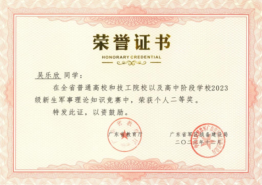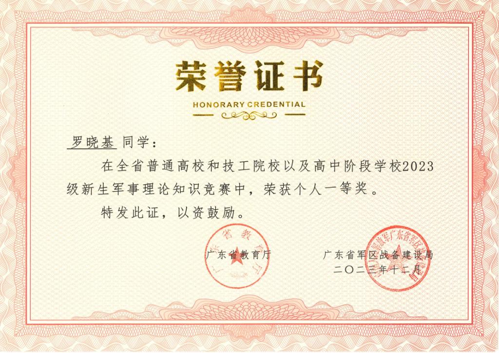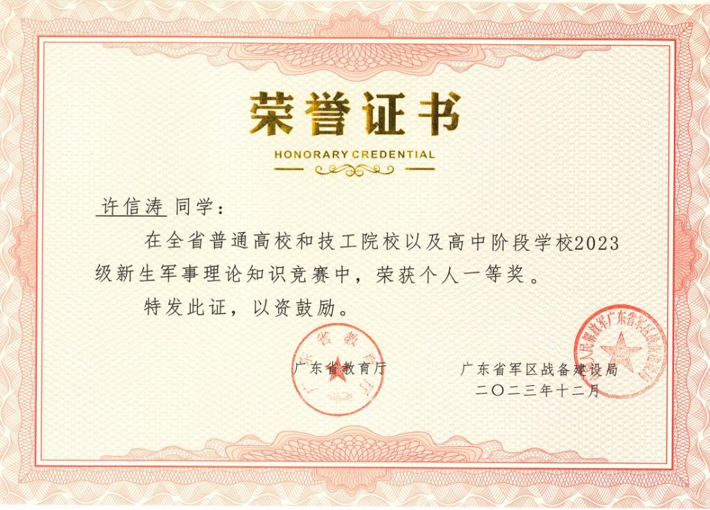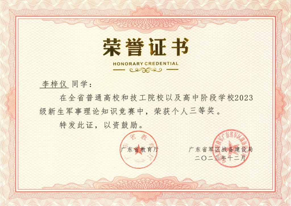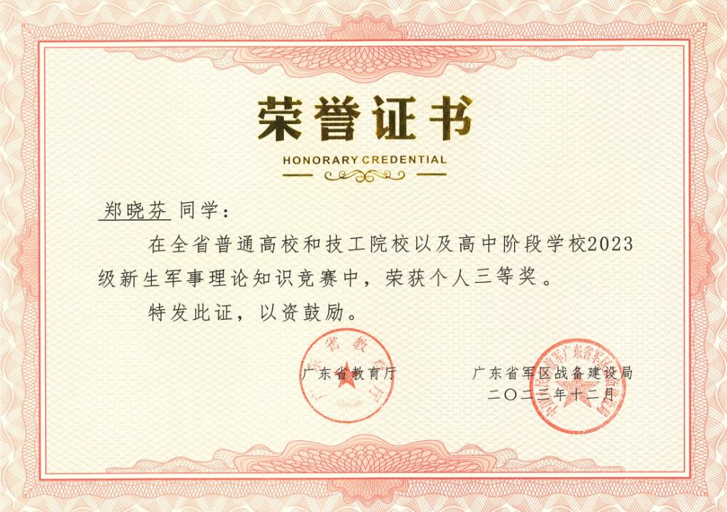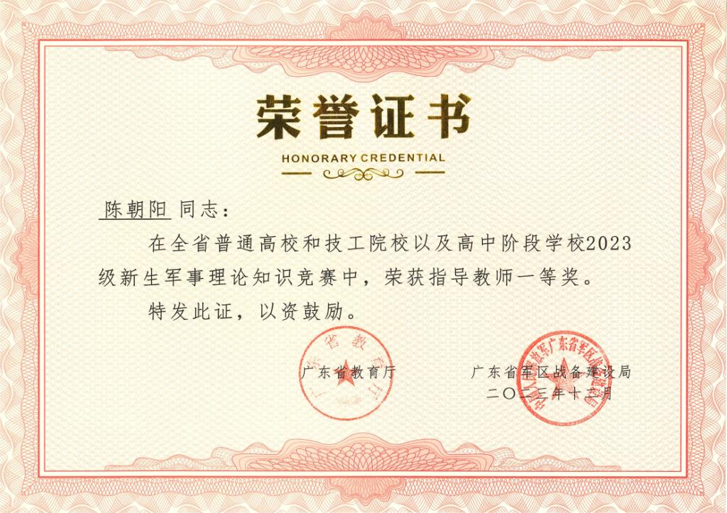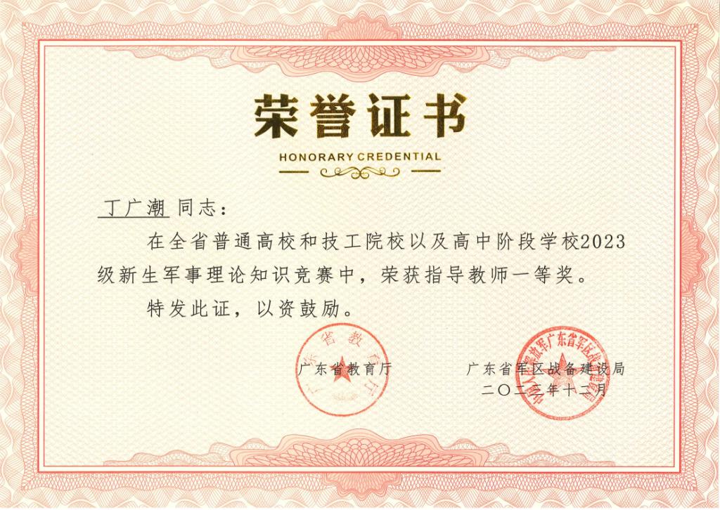 近日,由广东省教育厅、广东省人力资源和社会保障厅、广东省军区战备建设局联合主办的全省普通高校和技工院校以及高中阶段学校2023级新生军事理论知识竞赛结果揭晓。我校成绩优异,参赛学生中共有6名学生获奖,其中一等奖、二等奖、三等奖获奖各2名。陈朝阳、丁广潮两位教师荣获优秀指导教师一等奖。学校荣获组织单位三等奖。
