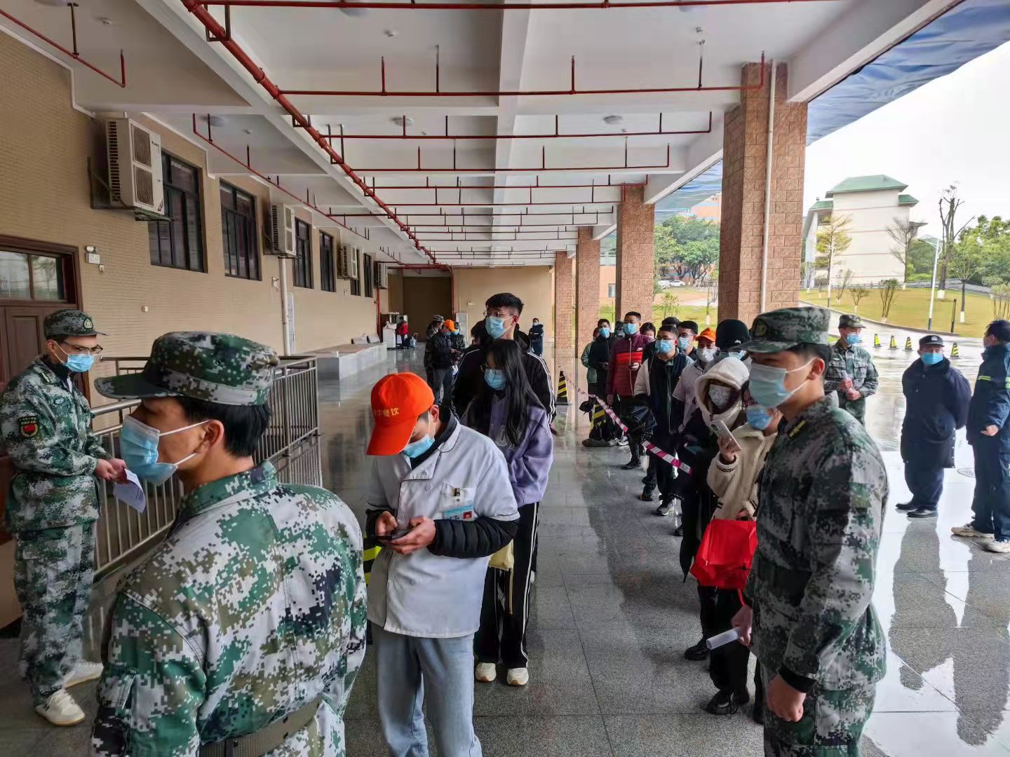 上午9:30分,受检人员严格遵守校园封闭检测管理相关要求,采样过程全部自觉排队、佩戴口罩、保持间距,在退伍复学学生为主体的志愿者引导下有序进入检测场地,经工作人员登记核对信息,完成咽拭子采集后,迅速离场。
