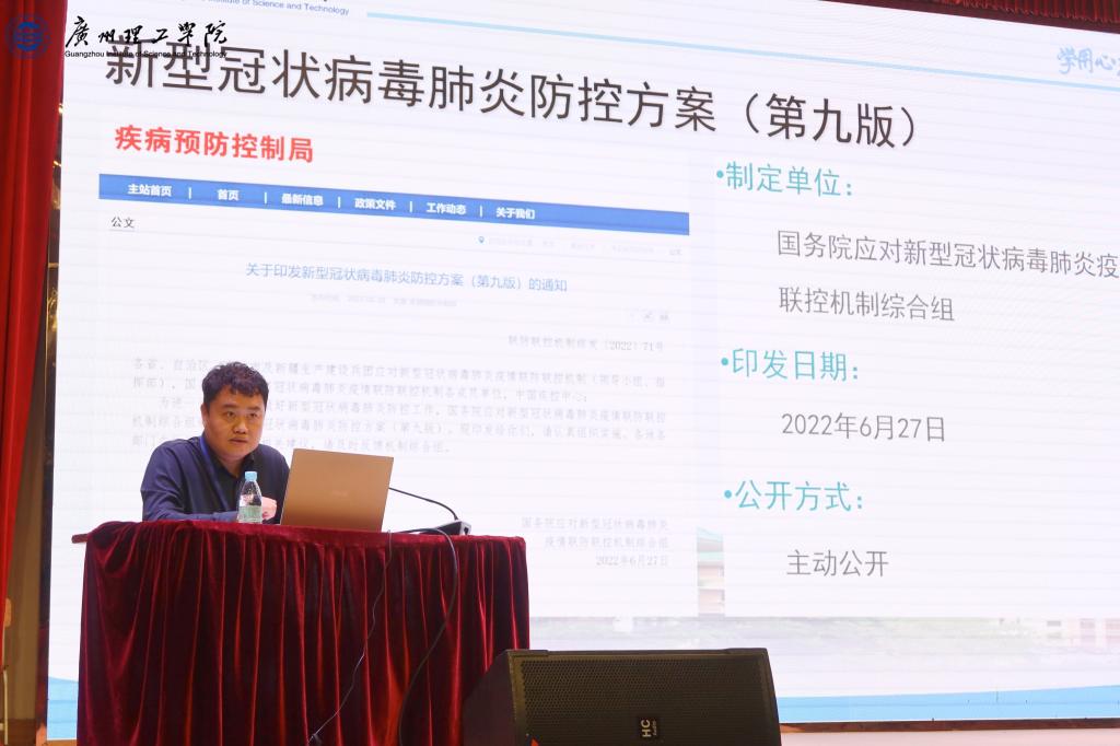 11月9日,为深入学习贯彻《新型冠状病毒肺炎防控方案(第九版)》,规范有序落实科学精准防控措施,切实提高我校疫情防控规范化处置能力,保障师生生命安全和身体健康,根据秋季学期“三全育人”素质教育周活动安排,学校疫情防控办主任陈朝阳在一号报告厅开展新型冠状病毒肺炎防控方案(第九版)专题培训,防控办成员、各单位健康管理员和师生代表等450余人参加培训会。