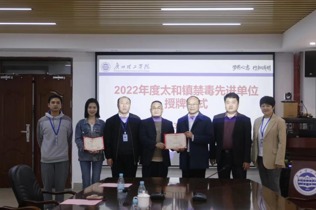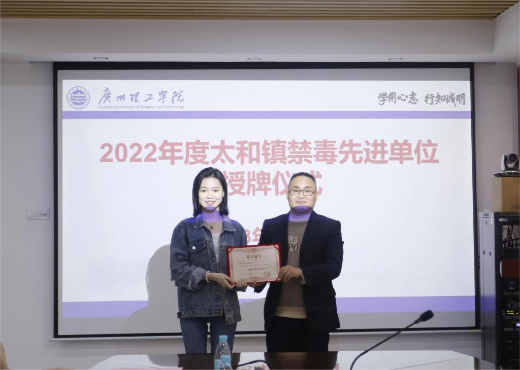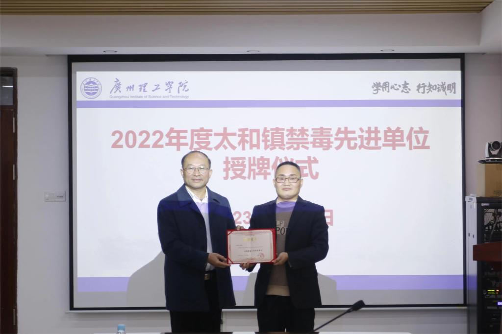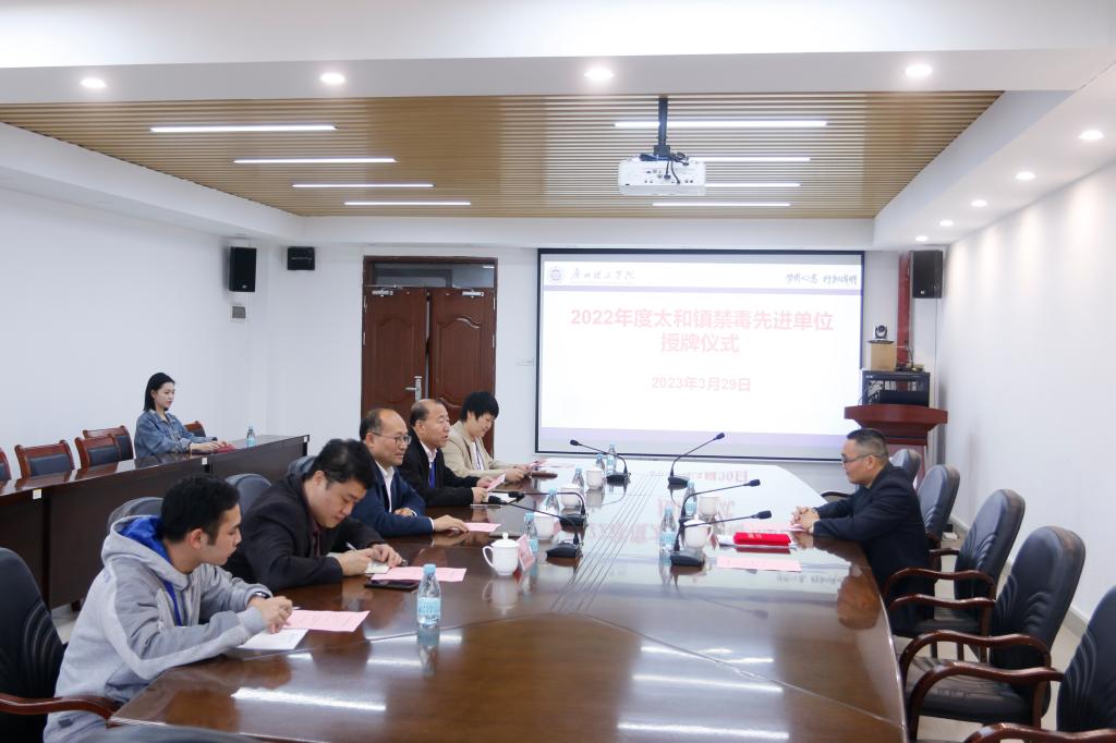 3月29日下午,白云区太和镇禁毒办负责人王导莅临学校指导检查校园禁毒工作,并与学校党委书记黄圣诚,党委副书记、副校长肖海进行座谈交流,同时向我校颁发2022年度全镇禁毒工作“先进单位”,以及向音乐舞蹈学院20音表2班陈颖琳同学颁发2022年度“禁毒工作先进个人“荣誉称号。