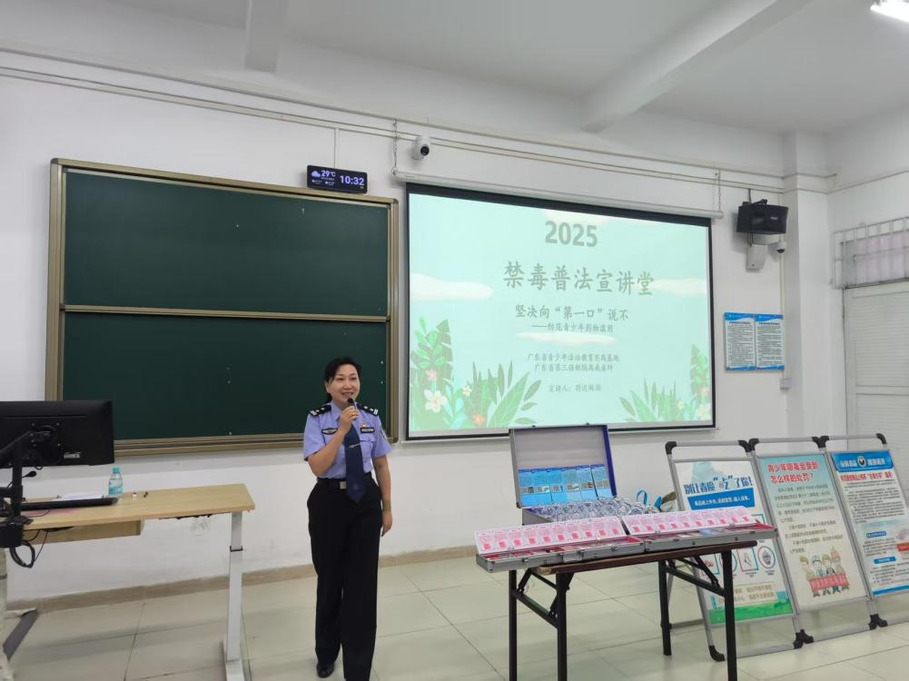 活动当天,广东省第三强制隔离戒毒所的多名警官、广东省青少年法治教育实践基地工作人员以及太和镇禁毒办负责人王导一同来到校。他们不仅带来了丰富的禁毒宣传资料,还通过生动的案例讲解、毒品仿真模型展示、互动问答、现场感受模拟吸毒情景等多种形式,为师生们带来了一场别开生面的禁毒教育课。