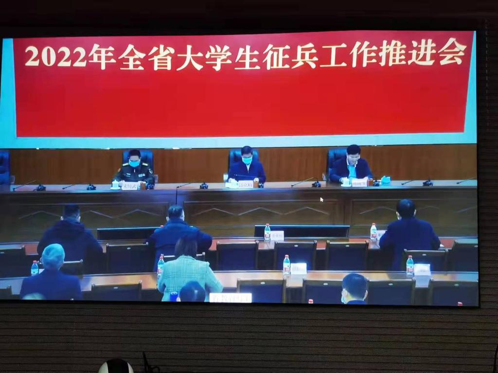 2月10日,省教育厅召开2022年全省大学生征兵工作推进会。省教育厅二级巡视员邱克楠,省征兵办副主任、省军区动员局副局长宋纯武出席会议并讲话。党委副书记兼副校长肖海及党委武装部(征兵工作站)、学生处、财务处、教务处等职能部门负责人在行政楼815会议室通过视频参加了会议。