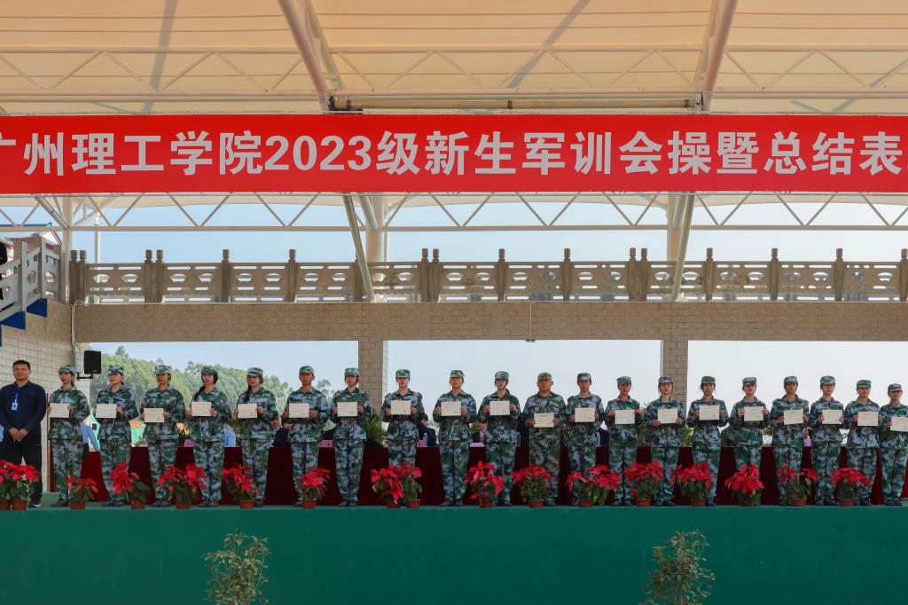 惠州博罗校区管委会主任彭文刚宣读军训表彰决定,对23电气3班等20个先进集体和林俊彬等273名军训先进个人予以表彰,校领导为先进集体和先进个人颁发锦旗、荣誉证书。